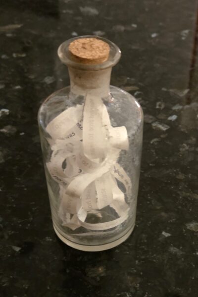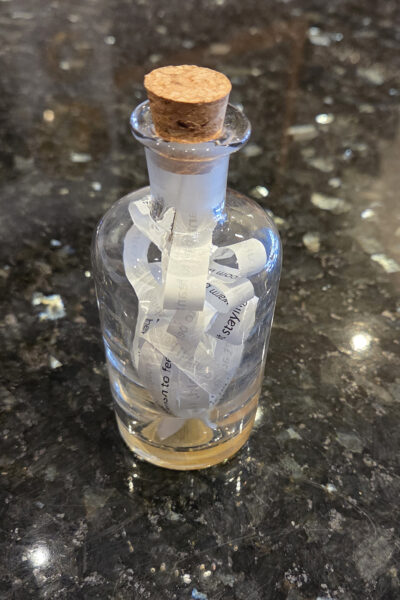 With this theme was taken back to a song that was important to me as a young, romantic woman – Jim Croce’s Time in a Bottle. I’ve become more cynical over the years—time passes and dreams become disappointments—reality steps in. I’ve written a new version and again, time is in a bottle.