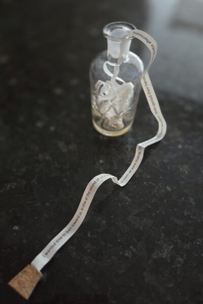 Inkjet print on bible paper held in vintage apothecary bottle.