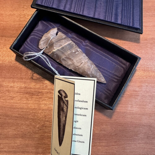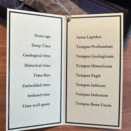 To echo the work and time involved in creating the spearhead I created a luxurious padded box to contain the flint. The end result feels like an object that belongs in a cabinet of curiosities. I translated the list into Latin, referencing how knowledge was kept behind a linguistic firewall when Wunderkammer were at the height of their popularity in the 16th Century.